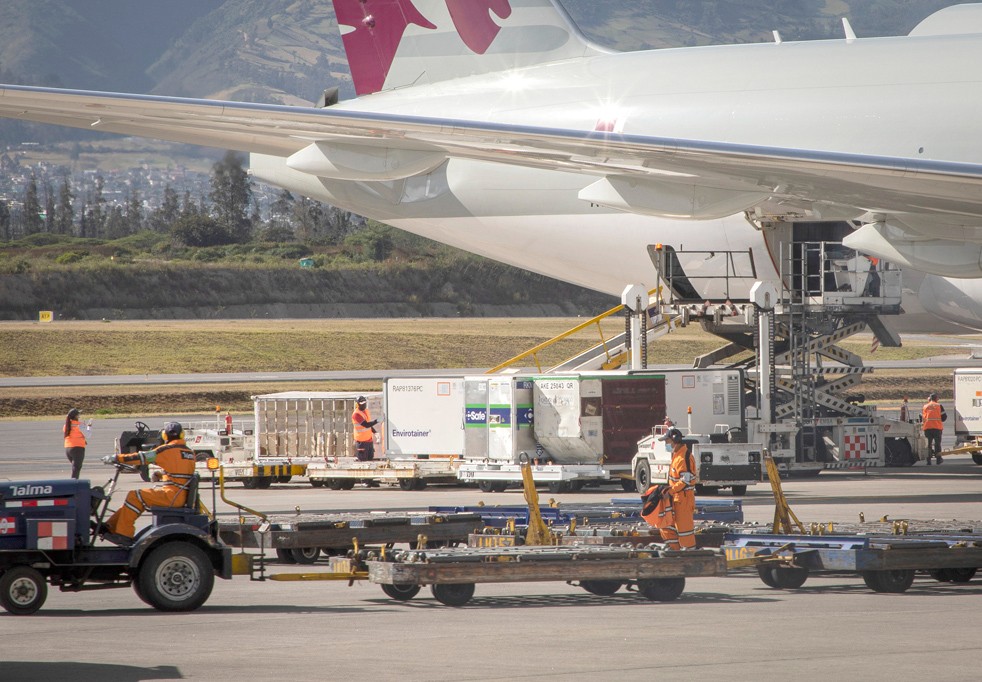 8月3日,工作人員在厄瓜多爾首都基多蘇克雷國(guó)際機(jī)場(chǎng)轉(zhuǎn)運(yùn)新冠疫苗。