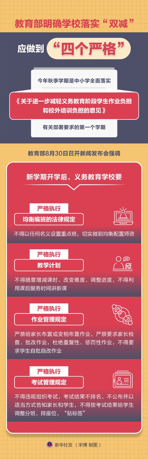 圖表:教育部明確學(xué)校落實“雙減”應(yīng)做到“四個嚴(yán)格”