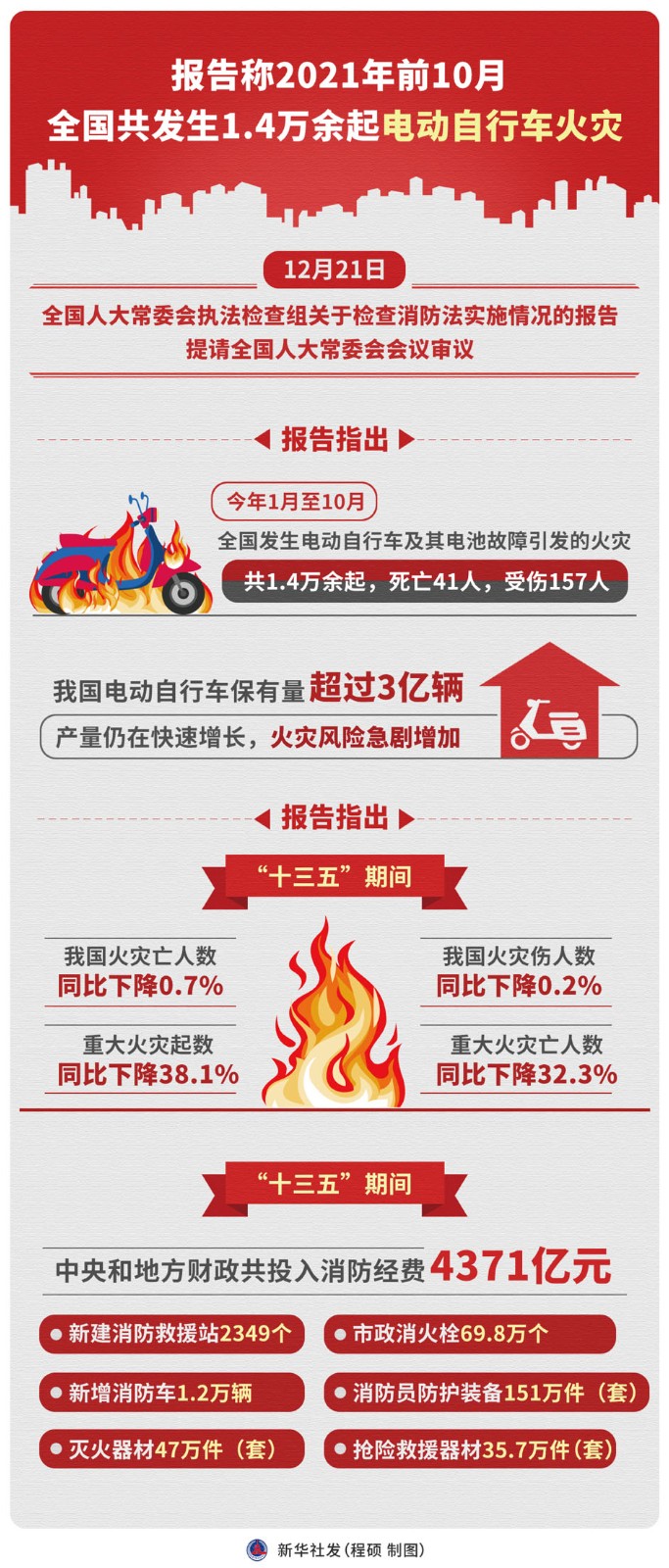 12月21日,全國人大常委會執(zhí)法檢查組關(guān)于檢查消防法實施情況的報告提請全國人大常委會會議審議。報告指出,今年1月至10月,全國發(fā)生電動自行車及其電池故障引發(fā)的火災共1.4萬余起,死亡41人,受傷157人。