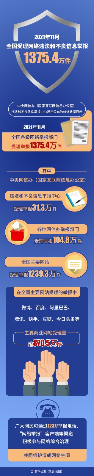 中央網(wǎng)信辦(國(guó)家互聯(lián)網(wǎng)信息辦公室)違法和不良信息舉報(bào)中心近日公布的統(tǒng)計(jì)數(shù)據(jù)顯示,今年11月,全國(guó)各級(jí)網(wǎng)絡(luò)舉報(bào)部門受理舉報(bào)1375.4萬(wàn)件。