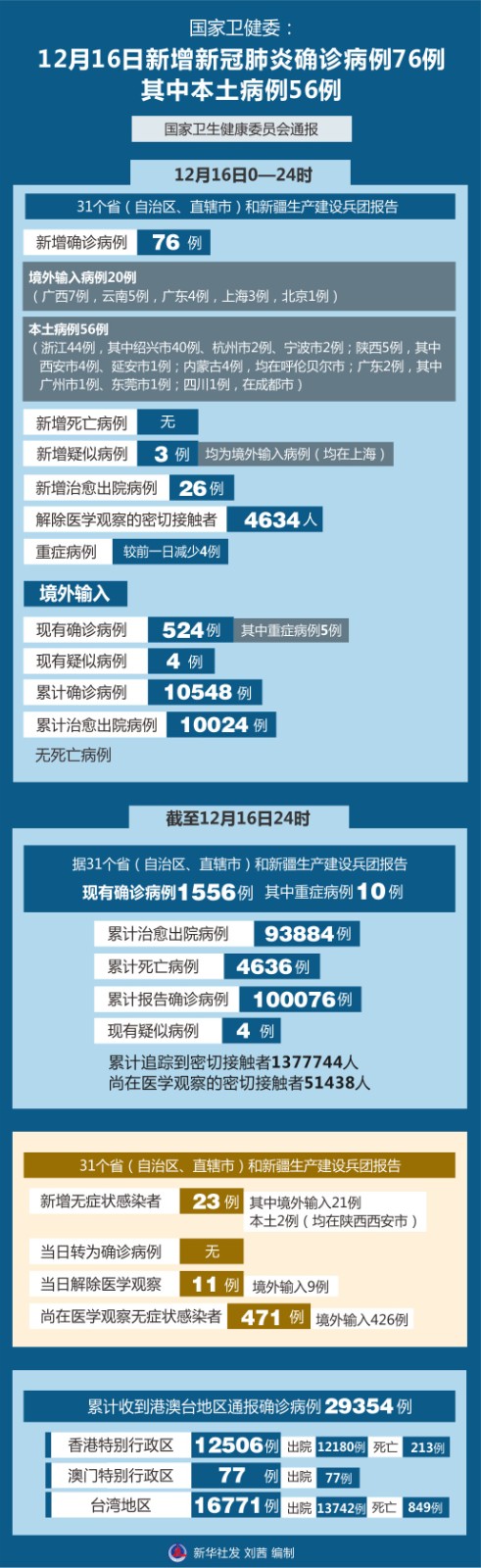 圖表:國(guó)家衛(wèi)健委:12月16日新增新冠肺炎確診病例76例 其中本土病例56例