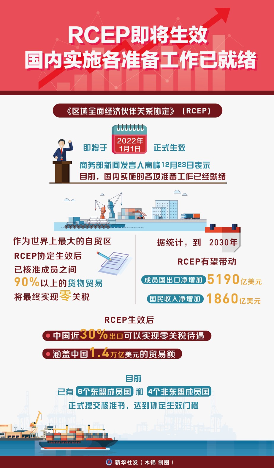 《區(qū)域全面經(jīng)濟伙伴關(guān)系協(xié)定》(RCEP)即將于2022年1月1日正式生效。商務(wù)部新聞發(fā)言人高峰12月23日表示,目前,國內(nèi)實施的各項準備工作已經(jīng)就緒。