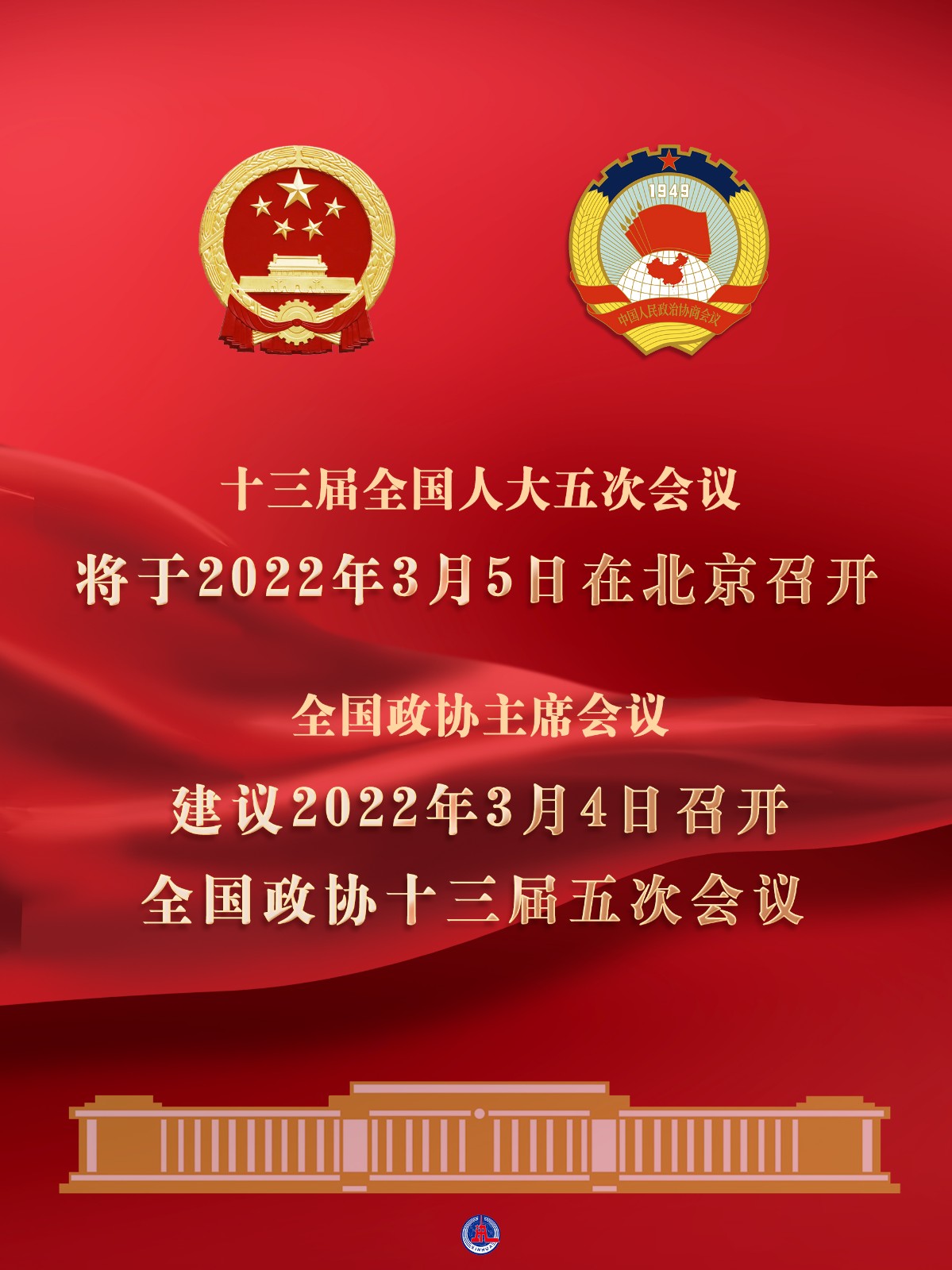 海報(bào):十三屆全國(guó)人大五次會(huì)議將于2022年3月5日在北京召開(kāi) 全國(guó)政協(xié)主席會(huì)議建議2022年3月4日召開(kāi)全國(guó)政協(xié)十三屆五次會(huì)議