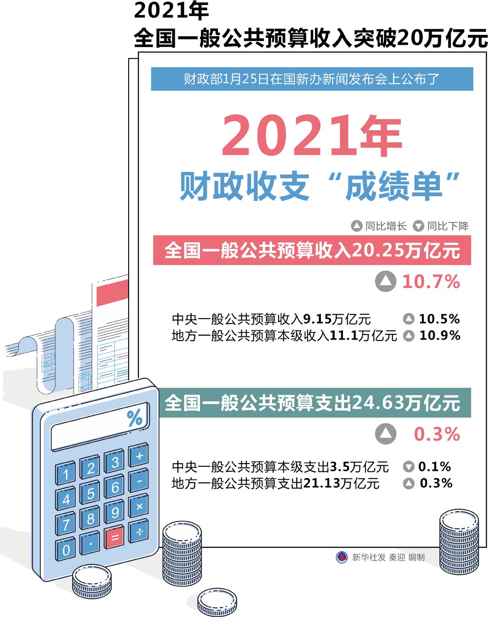 財(cái)政部1月25日在國(guó)新辦新聞發(fā)布會(huì)上公布了2021年財(cái)政收支“成績(jī)單”。數(shù)據(jù)顯示,2021年,全國(guó)一般公共預(yù)算收入20.25萬(wàn)億元,同比增長(zhǎng)10.7%;全國(guó)一般公共預(yù)算支出24.63萬(wàn)億元,同比增長(zhǎng)0.3%。