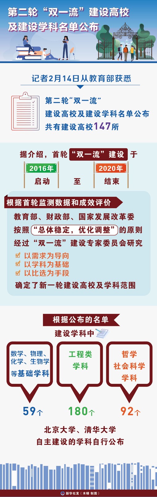 2月14日從教育部獲悉,第二輪“雙一流”建設(shè)高校及建設(shè)學(xué)科名單公布,共有建設(shè)高校147所。