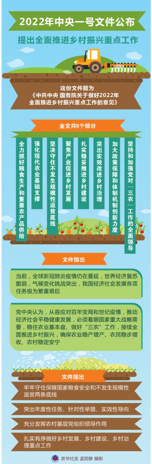 這份文件題為《中共中央 國務(wù)院關(guān)于做好2022年全面推進鄉(xiāng)村振興重點工作的意見》,全文共8個部分,包括:全力抓好糧食生產(chǎn)和重要農(nóng)產(chǎn)品供給、強化現(xiàn)代農(nóng)業(yè)基礎(chǔ)支撐、堅決守住不發(fā)生規(guī)模性返貧底線、聚焦產(chǎn)業(yè)促進鄉(xiāng)村發(fā)展、扎實穩(wěn)妥推進鄉(xiāng)村建設(shè)、突出實效改進鄉(xiāng)村治理、加大政策保障和體制機制創(chuàng)新力度、堅持和加強黨對“三農(nóng)”工作的全面領(lǐng)導。