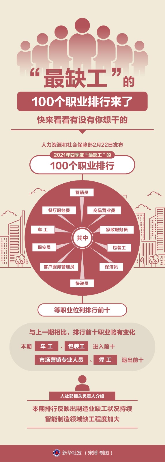 人力資源和社會(huì)保障部2月22日發(fā)布2021年四季度“最缺工”的100個(gè)職業(yè)排行,其中,營(yíng)銷員、餐廳服務(wù)員、商品營(yíng)業(yè)員、車工、家政服務(wù)員、保安員、包裝工、客戶服務(wù)管理員、保潔員、快遞員等職業(yè)位列排行前十。