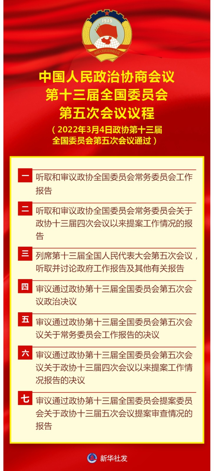 圖表:中國人民政治協(xié)商會議第十三屆全國委員會第五次會議議程
