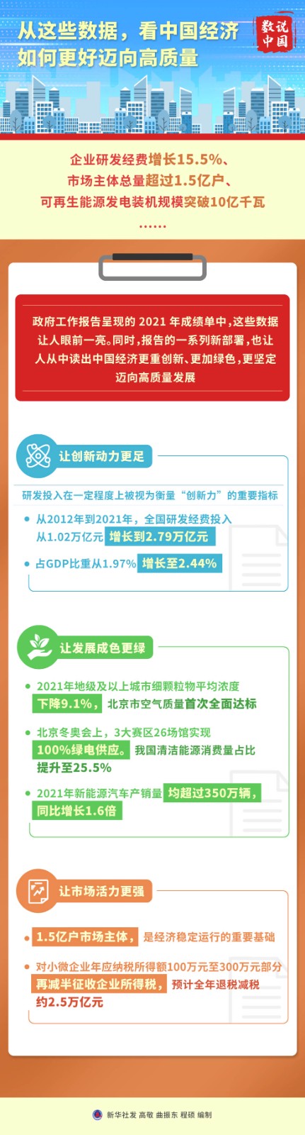 企業(yè)研發(fā)經(jīng)費增長15.5%、市場主體總量超過1.5億戶、可再生能源發(fā)電裝機規(guī)模突破10億千瓦……政府工作報告呈現(xiàn)的2021年成績單中,這些數(shù)據(jù)讓人眼前一亮。同時,報告的一系列新部署,也讓人從中讀出中國經(jīng)濟更重創(chuàng)新、更加綠色,更堅定邁向高質(zhì)量發(fā)展。