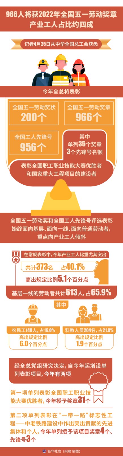 記者4月25日從中華全國(guó)總工會(huì)獲悉,今年全總將表彰全國(guó)五一勞動(dòng)獎(jiǎng)狀200個(gè)、全國(guó)五一勞動(dòng)獎(jiǎng)?wù)?66個(gè)、全國(guó)工人先鋒號(hào)956個(gè),其中單列35個(gè)獎(jiǎng)?wù)隆?個(gè)先鋒號(hào)名額,表彰全國(guó)職工職業(yè)技能大賽優(yōu)勝者和國(guó)家重大工程項(xiàng)目的建設(shè)者。