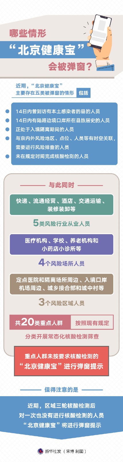 近期,“北京健康寶”主要存在五類被彈窗的情形,包括14日內(nèi)曾到訪有本土感染者的縣的人員;14日內(nèi)有陸路邊境口岸所在縣旅居史的人員;正處于入境隔離期間的人員;與京內(nèi)外風(fēng)險地區(qū)、點位、人員等有時空關(guān)聯(lián),需要進(jìn)行風(fēng)險排查的人員;未在規(guī)定時間完成核酸檢測的人員。