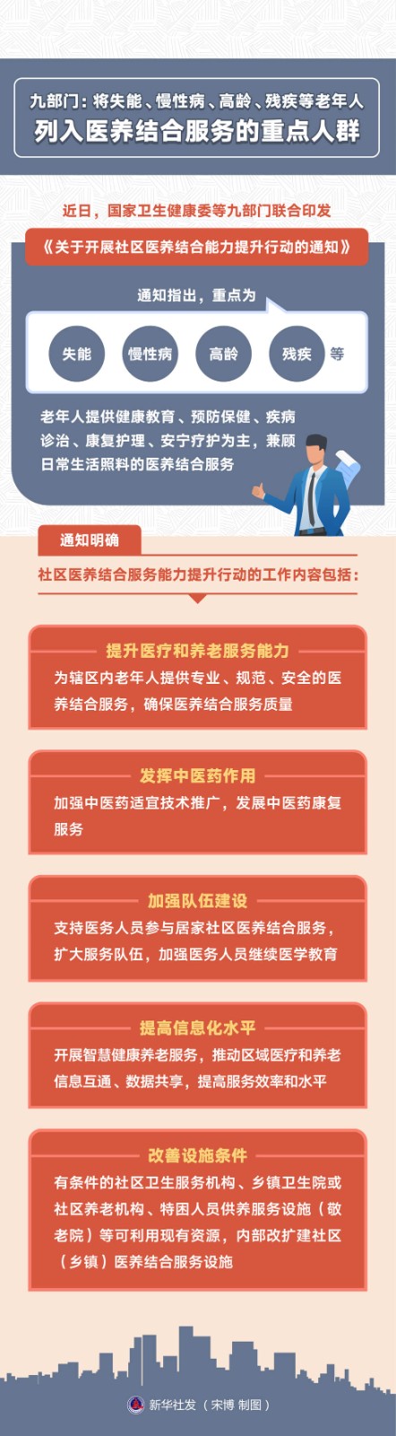 醫(yī)養(yǎng)結(jié)合是實(shí)現(xiàn)健康老齡化、滿足老年人健康養(yǎng)老服務(wù)需求的重要舉措。近日,國家衛(wèi)生健康委等九部門聯(lián)合印發(fā)《關(guān)于開展社區(qū)醫(yī)養(yǎng)結(jié)合能力提升行動的通知》。通知指出,重點(diǎn)為失能、慢性病、高齡、殘疾等老年人提供健康教育、預(yù)防保健、疾病診治、康復(fù)護(hù)理、安寧療護(hù)為主,兼顧日常生活照料的醫(yī)養(yǎng)結(jié)合服務(wù)。