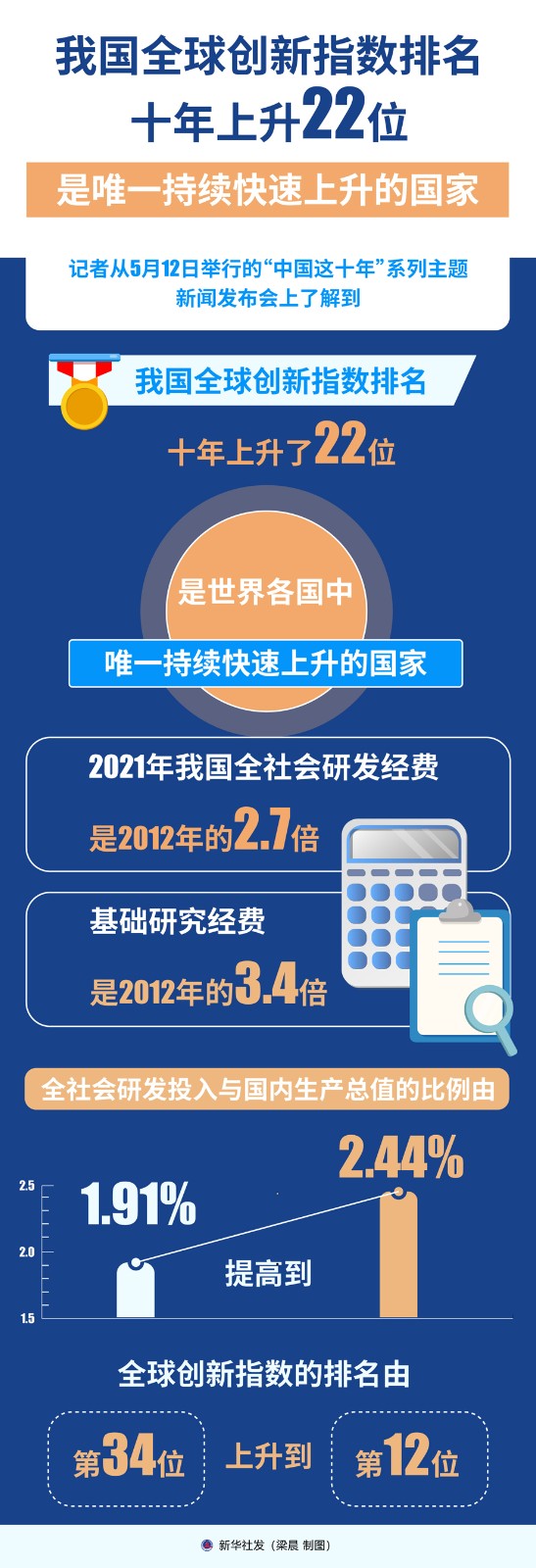 記者從5月12日舉行的“中國(guó)這十年”系列主題新聞發(fā)布會(huì)上了解到,2021年我國(guó)全社會(huì)研發(fā)經(jīng)費(fèi)是2012年的2.7倍,基礎(chǔ)研究經(jīng)費(fèi)是2012年的3.4倍。我國(guó)全球創(chuàng)新指數(shù)排名十年上升了22位,是世界各國(guó)中唯一持續(xù)快速上升的國(guó)家。