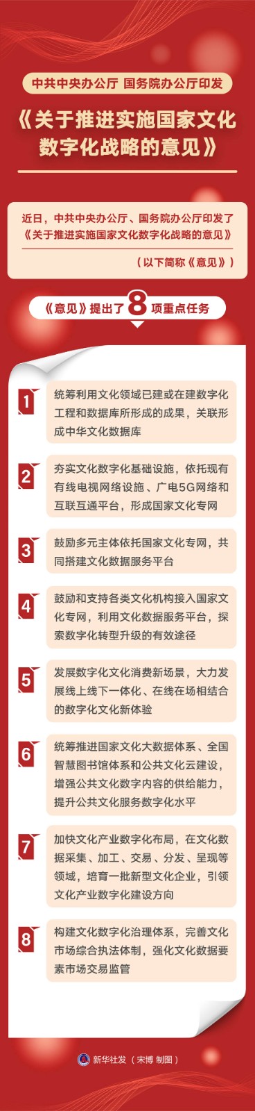 近日,中共中央辦公廳、國務院辦公廳印發(fā)了《關于推進實施國家文化數(shù)字化戰(zhàn)略的意見》,并發(fā)出通知,要求各地區(qū)各部門結合實際認真貫徹落實。