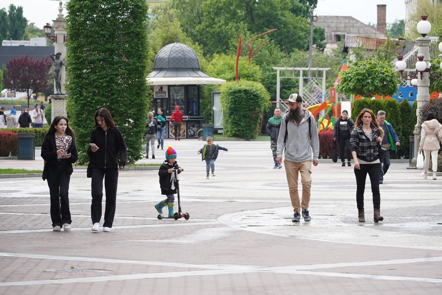 5月31日,當(dāng)?shù)鼐用裨跒蹩颂m基輔州伊爾平中心廣場(chǎng)散步。