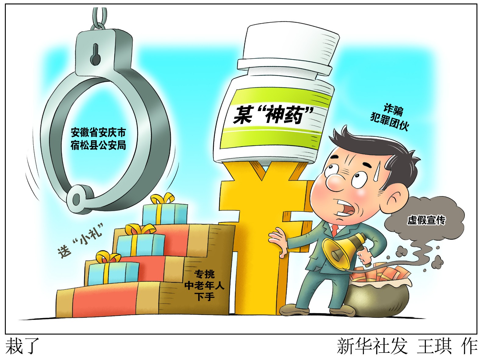 評(píng)書機(jī)、老人鞋等“小禮”請(qǐng)先笑納,“包治百病”的“神藥”快來試試?小心“騙你沒商量”!記者日前從安徽省安慶市宿松縣公安局了解到,當(dāng)?shù)鼐酱虻粢粋€(gè)向中老年群體虛假宣傳兜售藥品進(jìn)行詐騙的犯罪團(tuán)伙,全國多地?cái)?shù)千人上當(dāng),涉案金額近千萬元。
