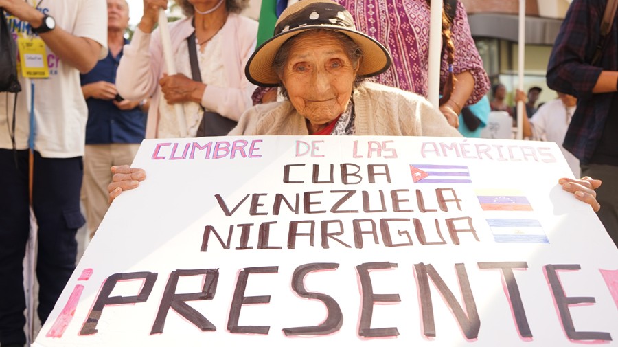 6月10日,在美國加利福尼亞州洛杉磯,一名抗議者手持標(biāo)語牌參加游行,抗議美國拒絕古巴、尼加拉瓜、委內(nèi)瑞拉三國領(lǐng)導(dǎo)人參加美洲峰會。