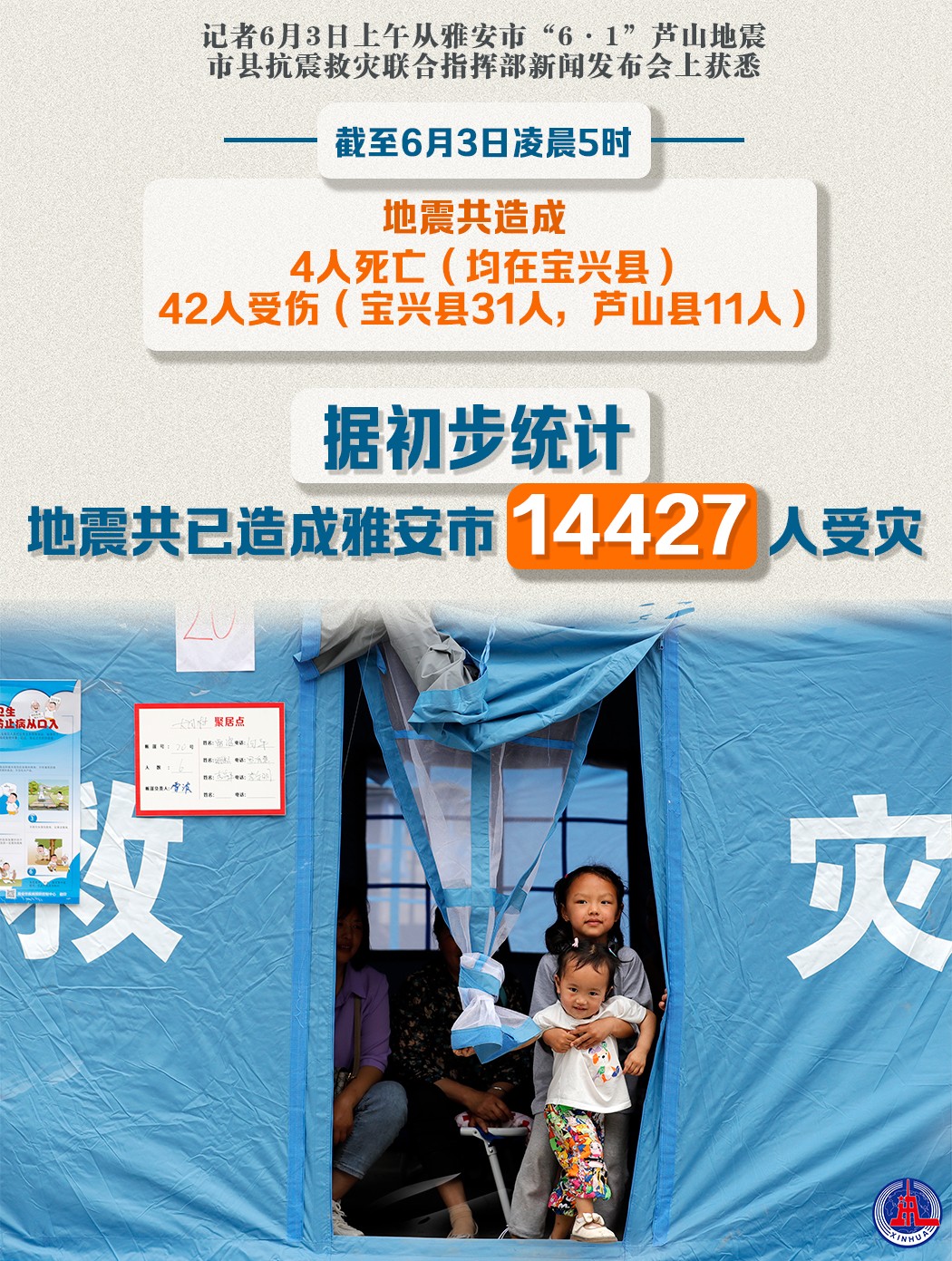 記者6月3日上午從雅安市“6·1”蘆山地震市縣抗震救災聯(lián)合指揮部新聞發(fā)布會上獲悉,截至6月3日凌晨5時,地震共造成4人死亡(均在寶興縣)、42人受傷(寶興縣31人,蘆山縣11人)。據(jù)初步統(tǒng)計,地震共已造成雅安市14427人受災。