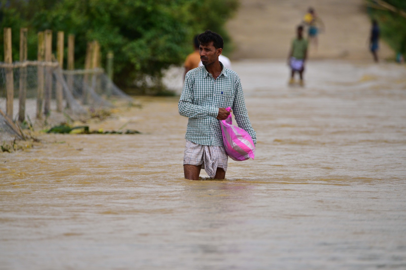 6月18日,在印度阿薩姆邦霍杰伊地區(qū),村民通過(guò)一條積水的道路。