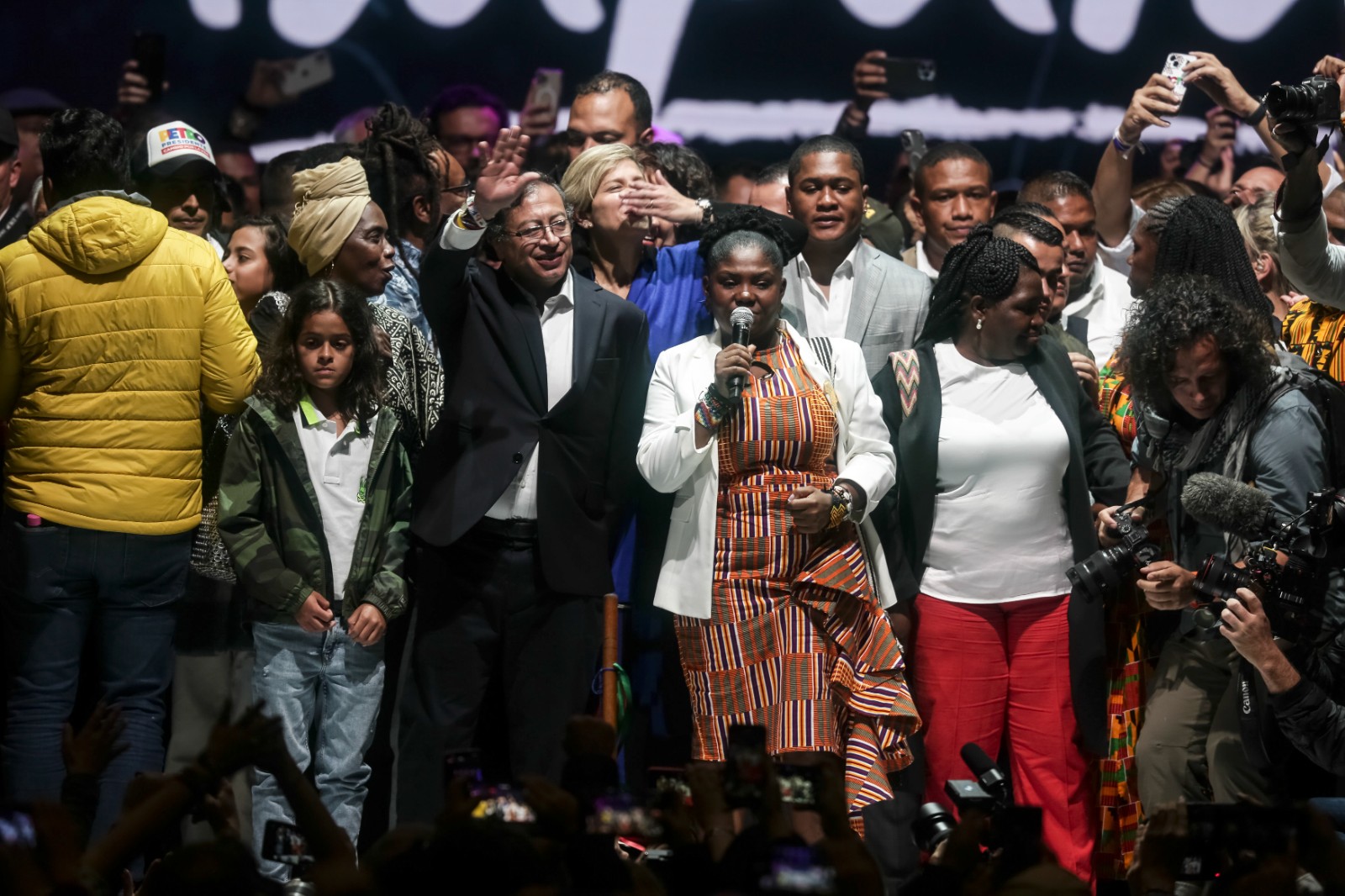 6月19日,左翼競選聯(lián)盟“哥倫比亞歷史公約聯(lián)盟”候選人古斯塔沃·佩特羅(前左三)與他的競選搭檔弗朗西亞·馬爾克斯(前左四)在哥倫比亞首都波哥大慶祝大選獲勝。