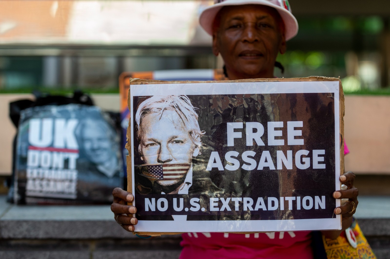 6月17日,一名女子在位于倫敦的英國內(nèi)政部大樓門前手舉寫有“釋放阿桑奇”的標(biāo)語牌。