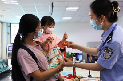 圖為6月3日,燈塔市公安局窗口服務(wù)大隊民警為前來辦理業(yè)務(wù)的群眾贈送平安小禮物。