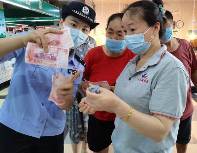 為提高居民識別假幣能力,連日來,安徽省蕪湖市公安局繁昌分局開展“打擊假幣犯罪,維護群眾財產(chǎn)安全”主題宣傳活動。圖為6月21日,繁昌分局經(jīng)偵大隊和馬壩派出所民警在菜市場向群眾宣傳如何識別假幣。