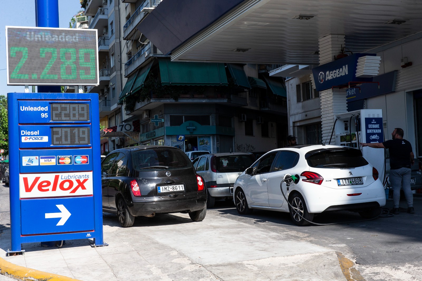 6月21日,汽車在希臘雅典一處加油站排隊(duì)加油。