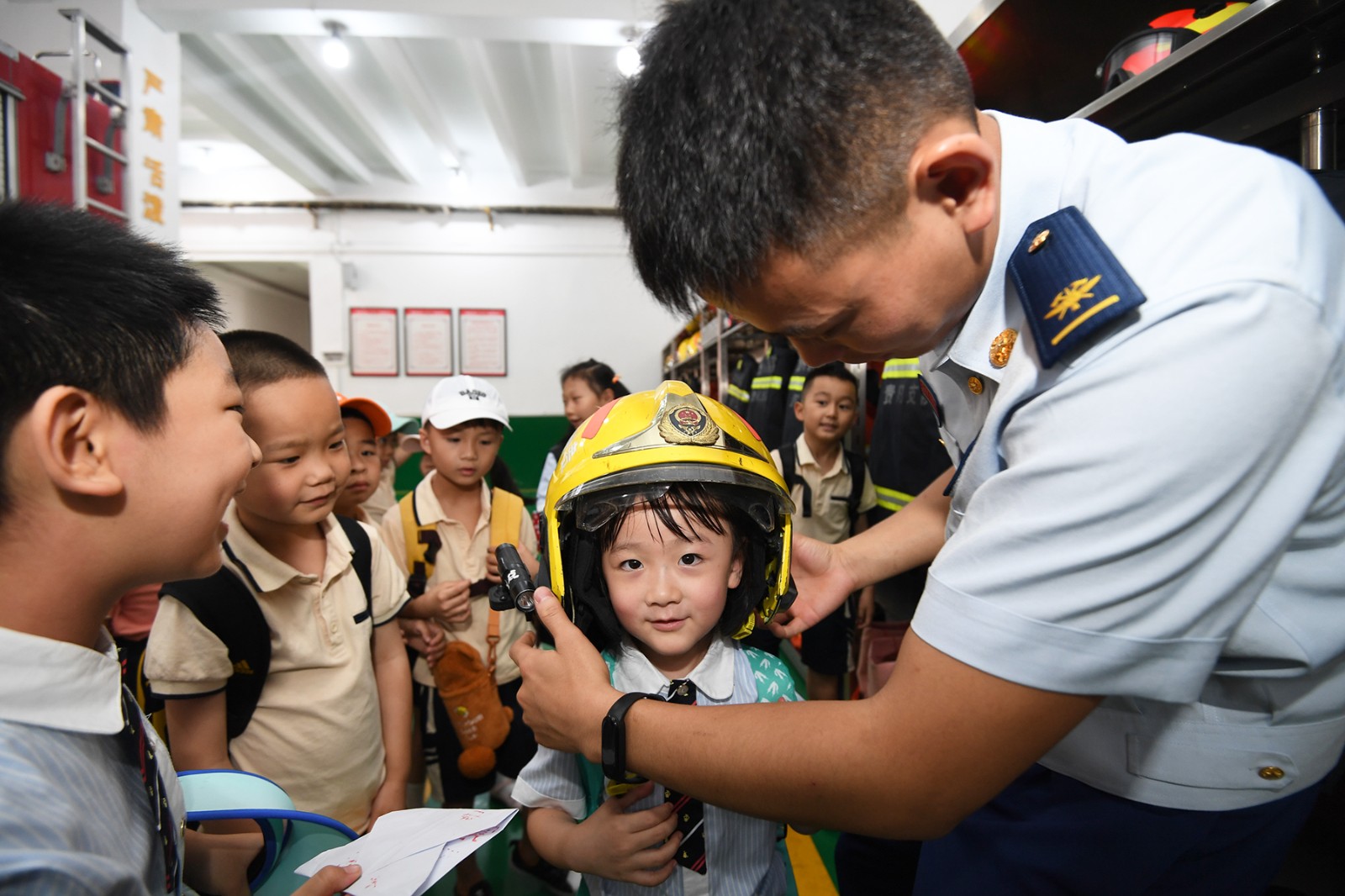 6月30日,貴州省貴陽市第十一幼兒園的小朋友在貴陽市南明區(qū)消防救援大隊(duì)體驗(yàn)消防救援頭盔。