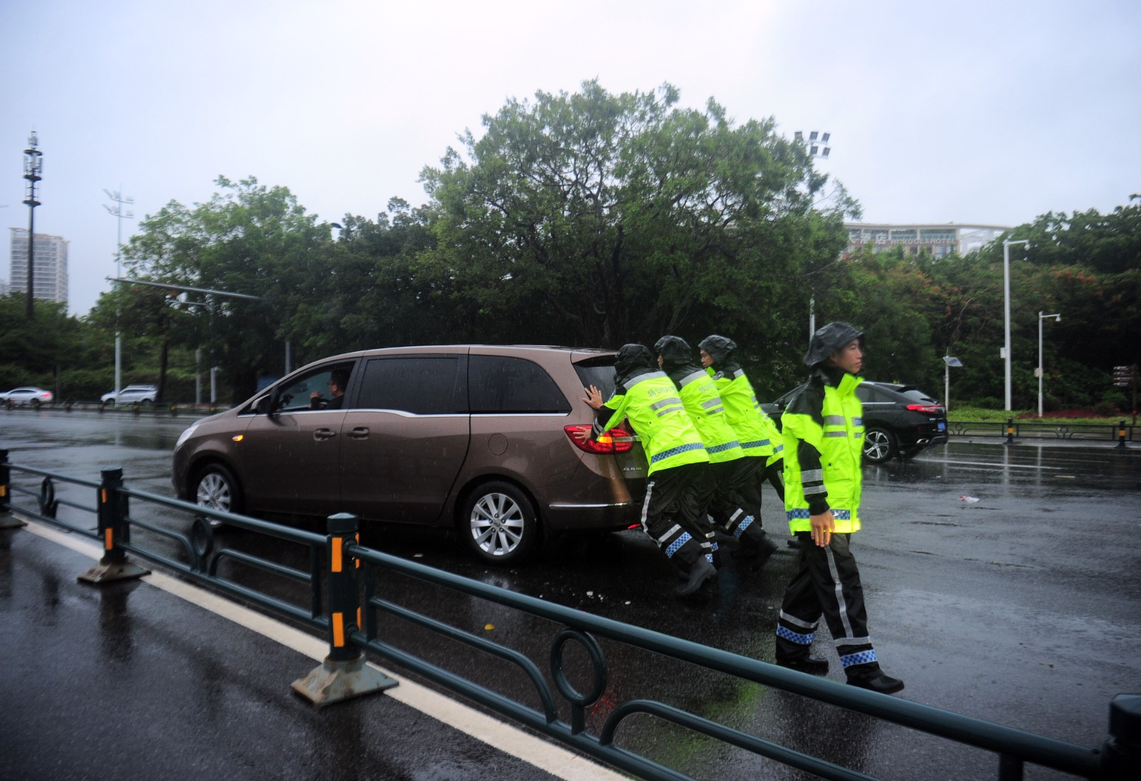 7月2日,在海南三亞,民警在雨中幫市民推故障車(chē)輛。