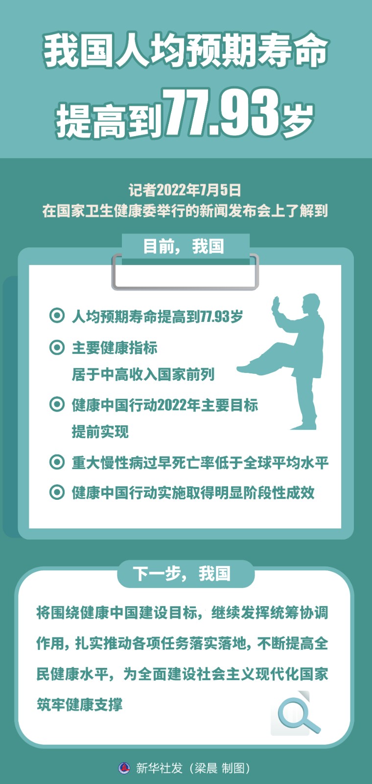 目前,我國人均預(yù)期壽命提高到77.93歲,主要健康指標(biāo)居于中高收入國家前列,健康中國行動2022年主要目標(biāo)提前實(shí)現(xiàn),重大慢性病過早死亡率低于全球平均水平,健康中國行動實(shí)施取得明顯階段性成效。