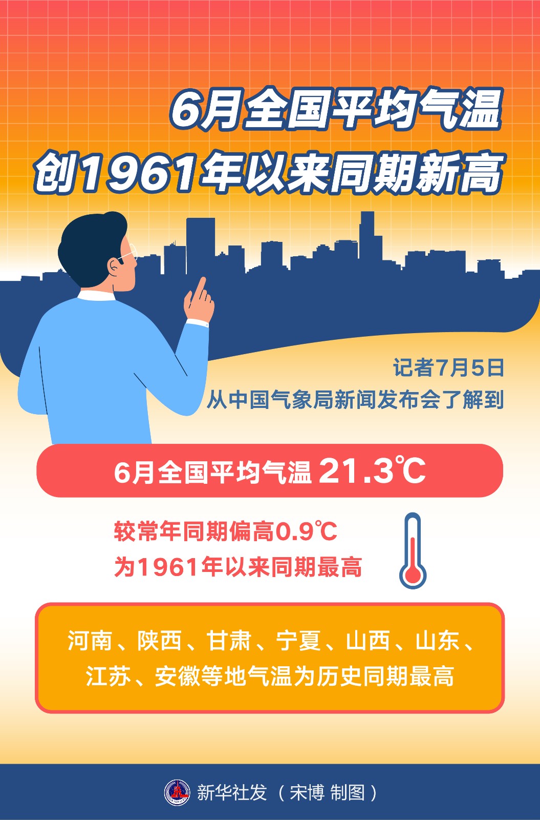 記者7月5日從中國(guó)氣象局新聞發(fā)布會(huì)了解到,6月全國(guó)平均氣溫21.3℃,較常年同期偏高0.9℃,為1961年以來同期最高。