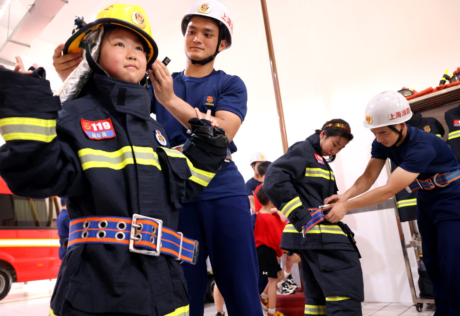 7月5日,消防員協(xié)助小學生穿戴消防戰(zhàn)斗服。