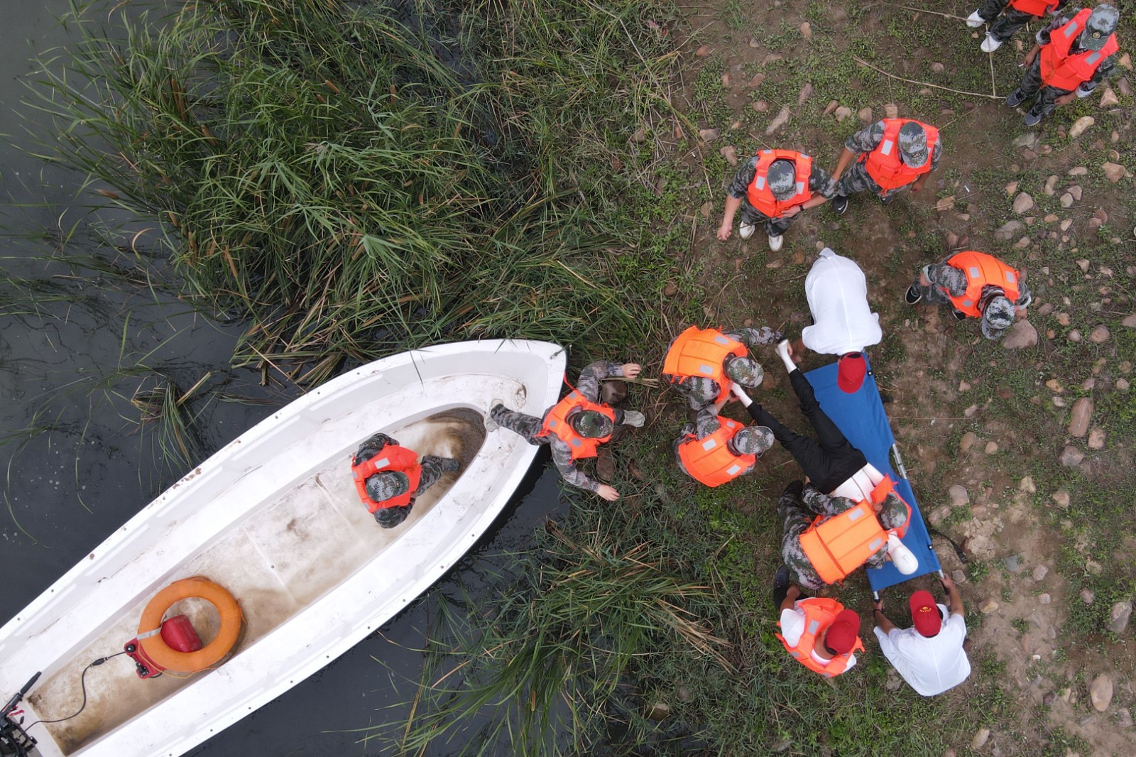 7月5日,在河北省沙河市十里亭鎮(zhèn)下解村舉行的防汛演練中,參演人員在演練營救“落水群眾”(無人機照片)。