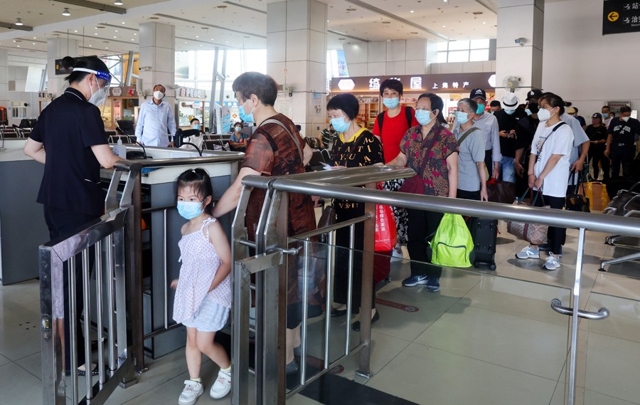 7月5日,在上海長途客運南站,旅客在檢票口檢票乘車。