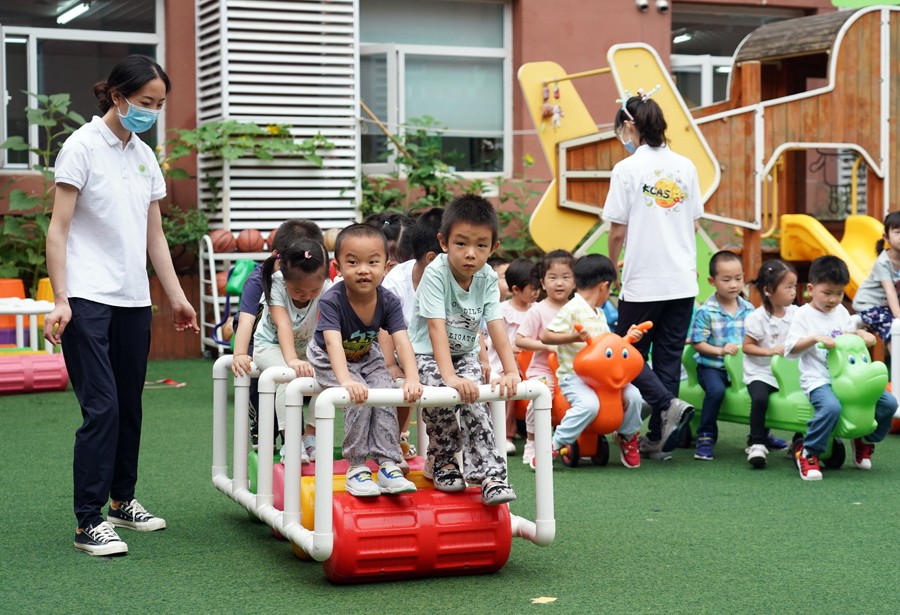 7月4日,在中國科學(xué)院第三幼兒園,小朋友們在戶外玩耍。