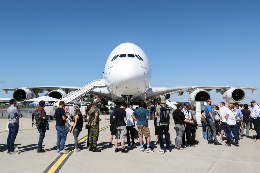 6月22日,在德國首都柏林南郊,人們排隊準備參觀阿聯(lián)酋航空公司空中客車A380-800客機。