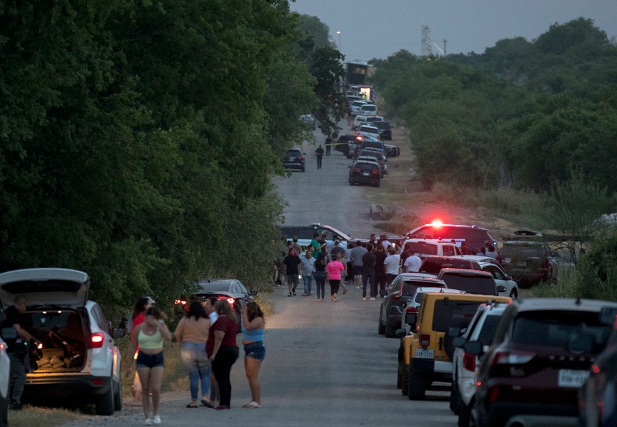 6月27日,人們聚集在美國(guó)得克薩斯州圣安東尼奧移民死亡事件現(xiàn)場(chǎng)附近。