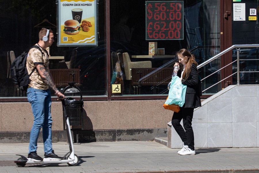 6月29日,在俄羅斯首都莫斯科,行人經(jīng)過(guò)一處外匯兌換點(diǎn)的匯率顯示屏。