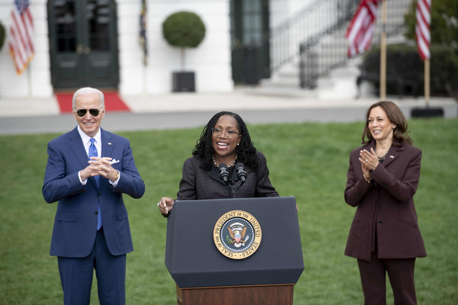 這是4月8日,凱坦吉·布朗·杰克遜(中)在美國華盛頓白宮與美國總統(tǒng)拜登(左)、副總統(tǒng)哈里斯共同出席活動(dòng)(資料照片)。