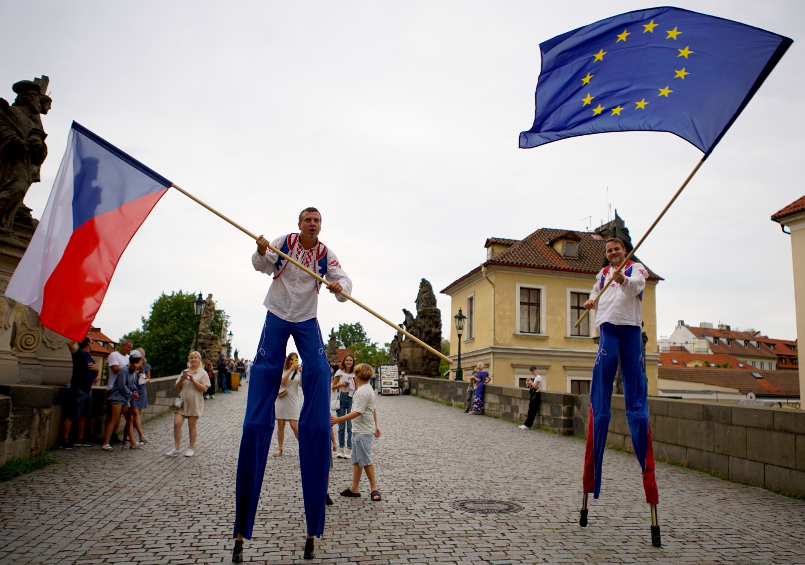 7月1日,人們在捷克首都布拉格老城區(qū)揮舞捷克國旗和歐盟旗幟。