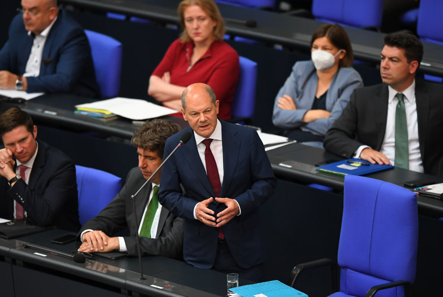 7月6日,德國(guó)總理朔爾茨(前右)在位于柏林的德國(guó)聯(lián)邦議會(huì)接受例行問詢。