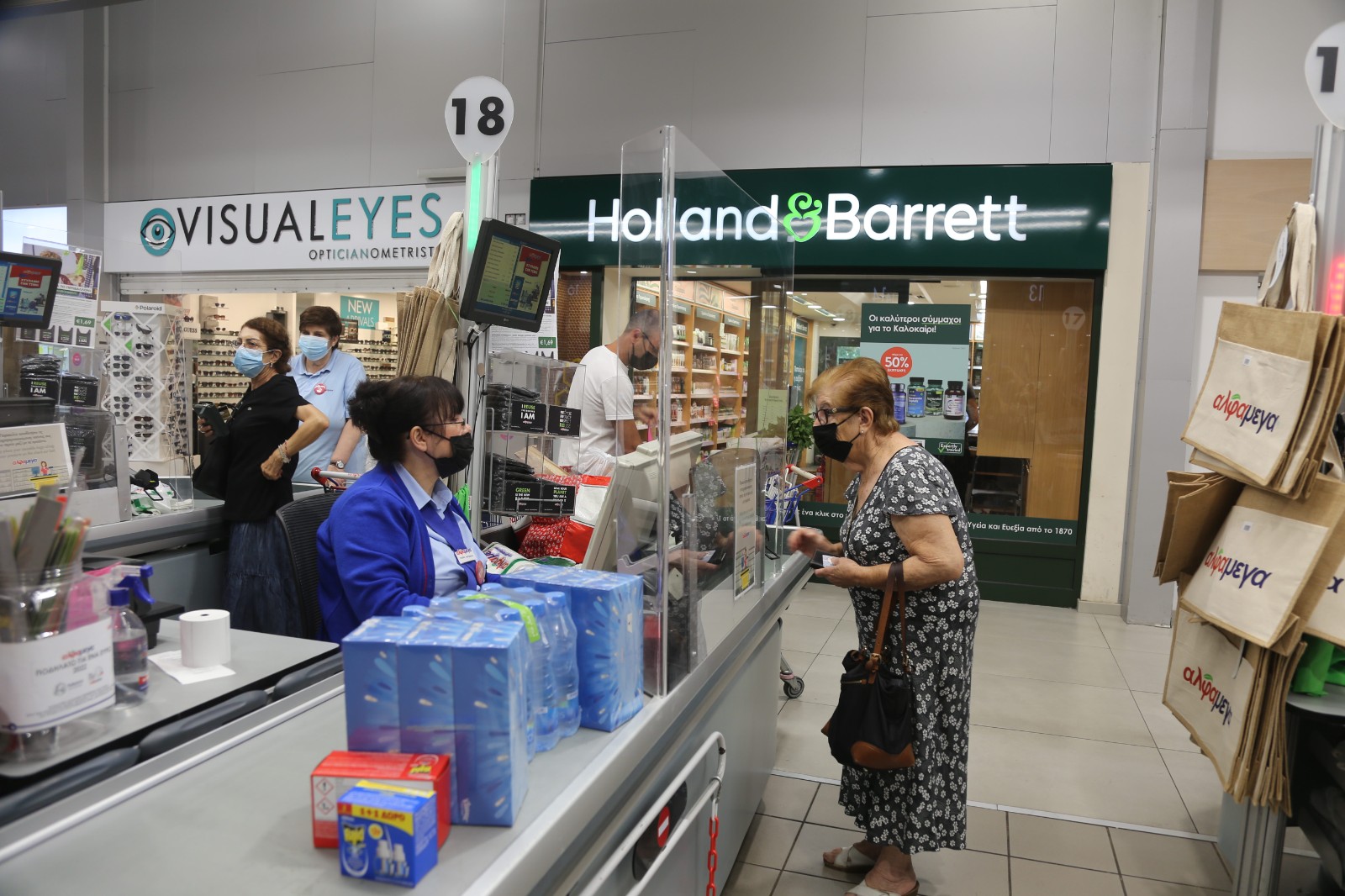 7月8日,人們佩戴口罩在塞浦路斯首都尼科西亞一家超市購物。