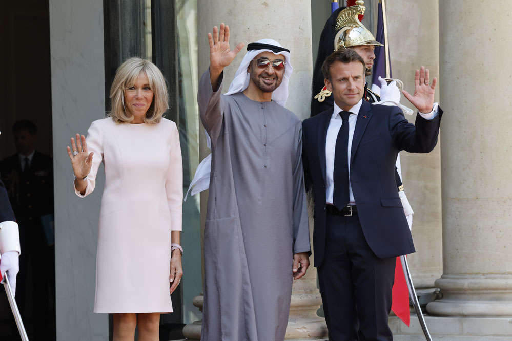 7月18日,法國總統(tǒng)馬克龍(右)和夫人布麗吉特在巴黎總統(tǒng)府愛麗舍宮迎接到訪的阿拉伯聯(lián)合酋長國總統(tǒng)穆罕默德(中)。