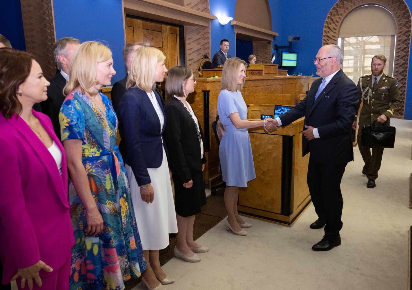 7月18日,在愛沙尼亞首都塔林,愛沙尼亞總統(tǒng)卡里斯(右二)在議會(huì)與愛沙尼亞總理、改革黨主席卡婭·卡拉斯(右三)握手,祝賀新聯(lián)合政府成立。
