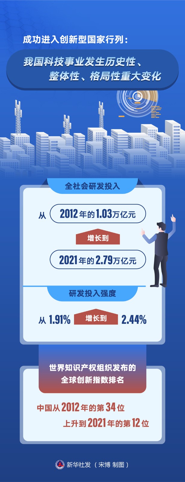 全社會(huì)研發(fā)投入從2012年的1.03萬億元增長(zhǎng)到2021年的2.79萬億元,研發(fā)投入強(qiáng)度從1.91%增長(zhǎng)到2.44%;世界知識(shí)產(chǎn)權(quán)組織發(fā)布的全球創(chuàng)新指數(shù)排名,中國從2012年的第34位上升到2021年的第12位……