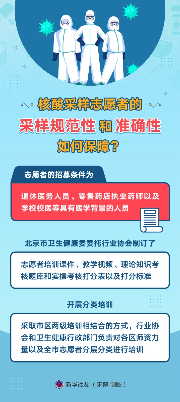 李昂表示,為確保志愿者采樣的規(guī)范性和準(zhǔn)確性,北京市衛(wèi)生健康委委托行業(yè)協(xié)會(huì)制訂了志愿者培訓(xùn)課件、教學(xué)視頻、理論知識(shí)考核題庫(kù)和實(shí)操考核打分表以及打分標(biāo)準(zhǔn),開(kāi)展分類培訓(xùn),采取市區(qū)兩級(jí)培訓(xùn)相結(jié)合的方式,行業(yè)協(xié)會(huì)和衛(wèi)生健康行政部門負(fù)責(zé)對(duì)各區(qū)師資力量以及全市志愿者分層分類進(jìn)行培訓(xùn)。