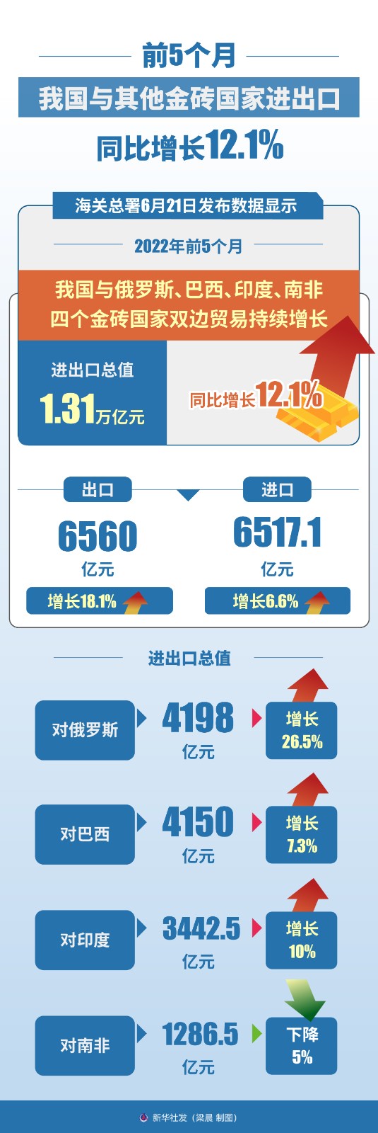 海關(guān)總署6月21日發(fā)布數(shù)據(jù)顯示,今年前5個月,我國與俄羅斯、巴西、印度、南非四個金磚國家雙邊貿(mào)易持續(xù)增長,進(jìn)出口總值1.31萬億元,同比增長12.1%,高出同期我國外貿(mào)整體增速3.8個百分點。