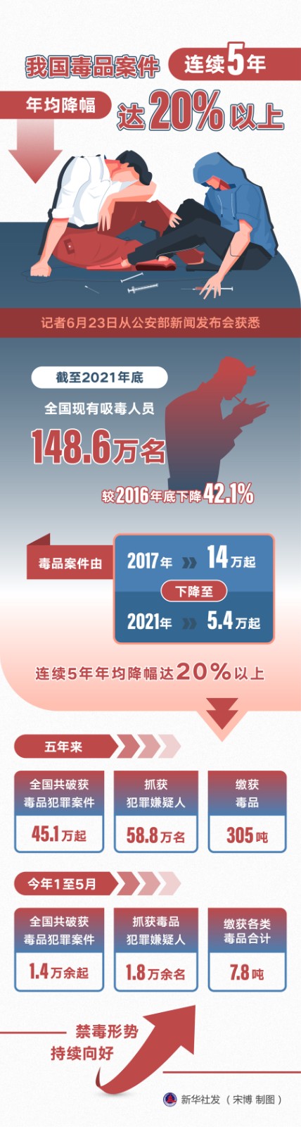 6月26日是第35個(gè)國(guó)際禁毒日。記者6月23日從公安部新聞發(fā)布會(huì)獲悉,截至2021年底,全國(guó)現(xiàn)有吸毒人員148.6萬(wàn)名,較2016年底下降42.1%;毒品案件由2017年的14萬(wàn)起下降至2021年的5.4萬(wàn)起,連續(xù)5年年均降幅達(dá)20%以上。