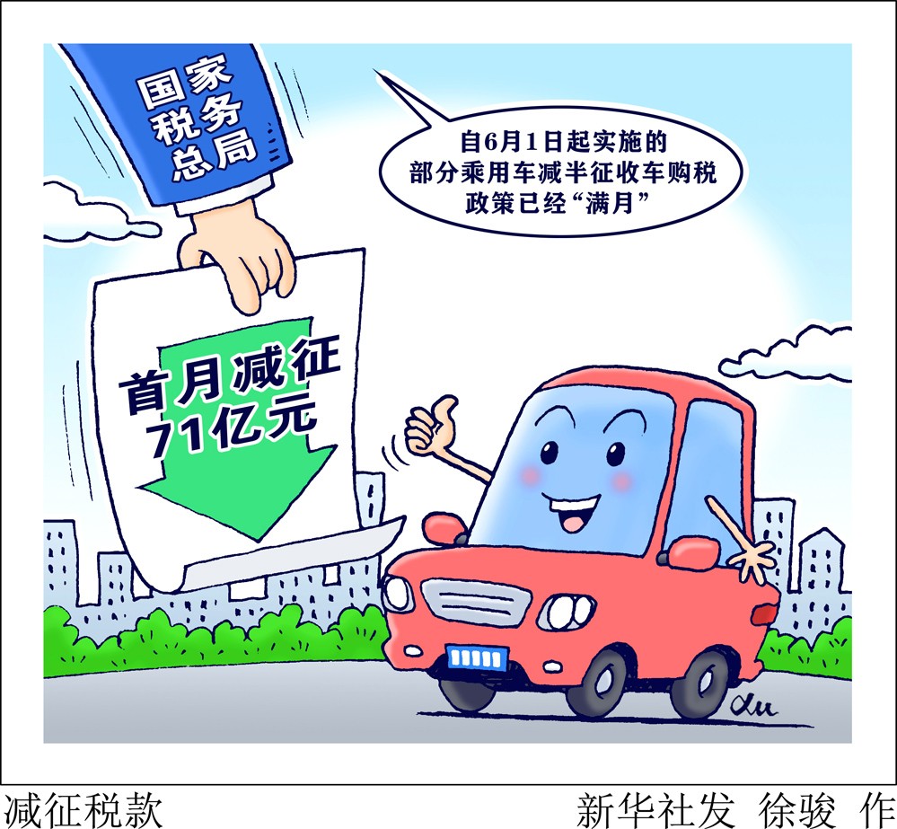 自6月1日起實施的部分乘用車減半征收車購稅政策已經(jīng)“滿月”。國家稅務(wù)總局最新數(shù)據(jù)顯示,政策實施首月,全國共減征車購稅71億元,減征車輛109.7萬輛。